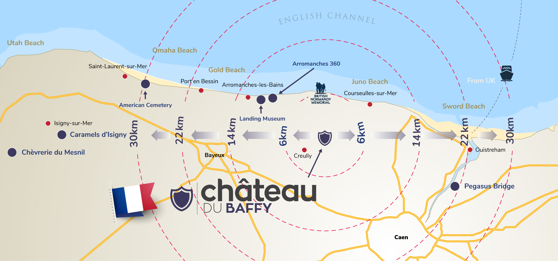 Most of our schools prefer the shorter ferry or Eurotunnel journey from Dover to Calais. It is then four hours on the coach to the Château du Baffy. The outbound and return journey from port to the Château du Baffy is usually broken up by a coach stop, for example in the beautiful town of Honfleur or a chocolate factory. Travel from other ferry ports is an option depending on your UK location. The Château is 25 minutes from Caen, one hour from Le Havre and 1 hour 30 minutes from Cherbourg. Speak to one of our knowledgeable Travel Advisors who will guide you through the best options for your school group.